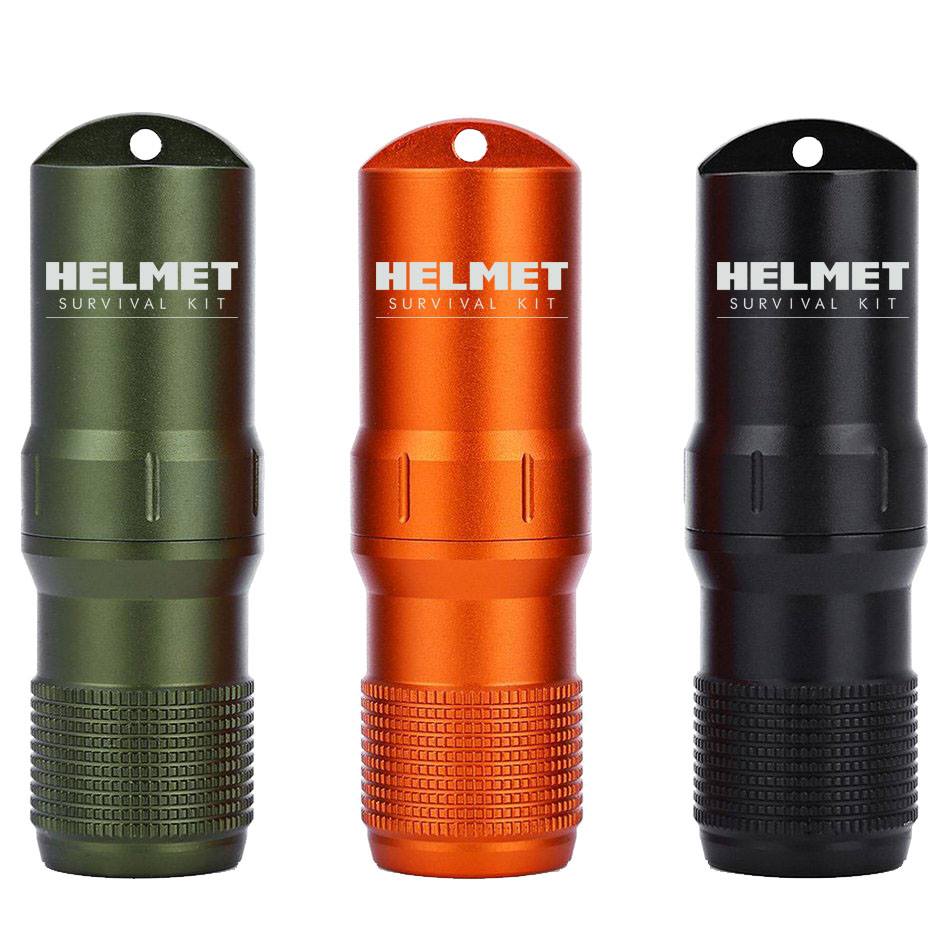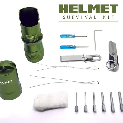 HELMET SURVIVAL KIT è un tank in alluminio anodizzato di soli 9x3cm, leggerissimo, completamente impermeabile, dotato di un paracord e un moschettone per attaccarlo alla cintura, che contiene tutti gli strumenti necessari per rigenerare: