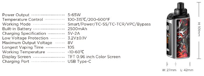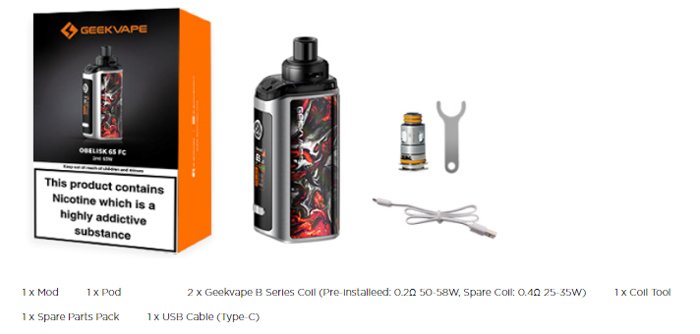 La Obelisk 65 FC, realizzata da Geekvape è la prima Pod a ricarica Rapida, che può essere caricata in soli 18 minuti ed è alimentata da due Batterie TUV DA 1100mAh, in grado di erogare 65W massimo, oltre ad essere molto elegante e potente, supporta anche la ricarica inversa OTG è l’adattatore di Ricarica USB-PD. Obelisk 65 dispone di un Display TFT a colori da 0,96″ e di diverse modalità di erogazione, tra cui Smart, Power, TC-SS, TC-TCR, VPC e Bypass. La Pod ha una capacità del Liquido per Sigaretta Elettronica pari a 4,5 ml ed è compatibile con tutta la serie B Coil, come la 0,2Ohm in NI80 e la 0,4Ohm in KA1 (incluse).