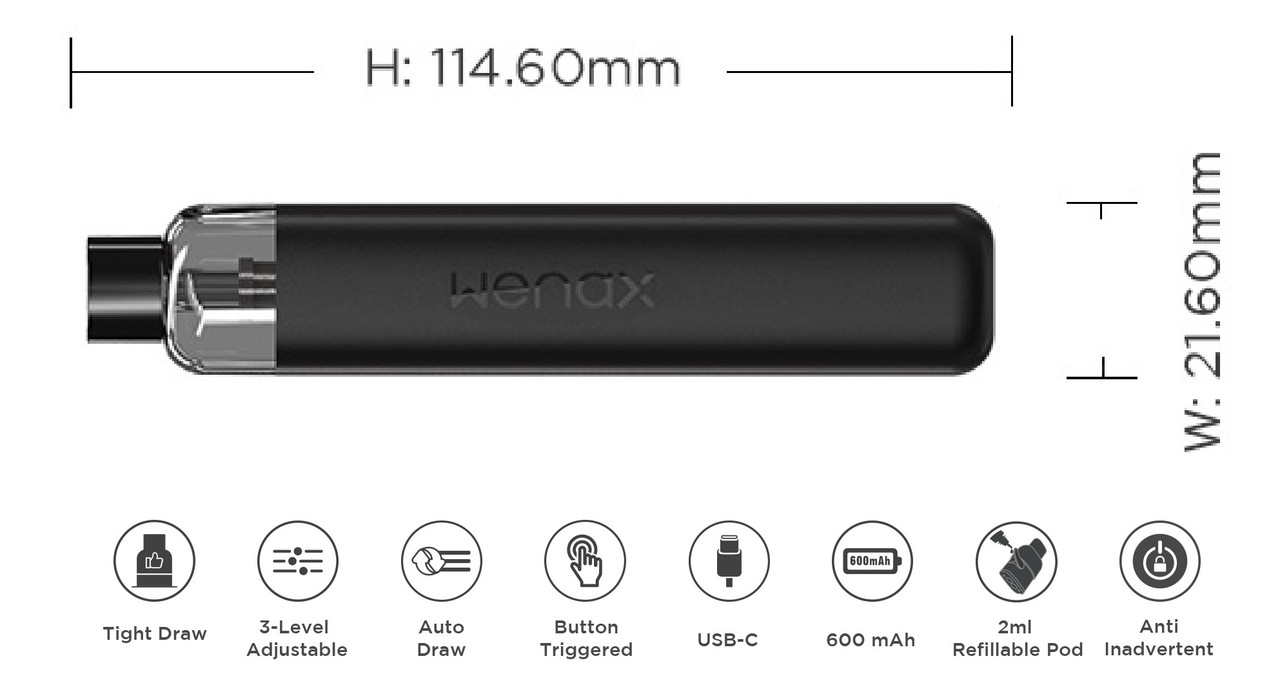 Geekvape Wenax K1 Starter kit è una sigaretta elettronica studiata per i principianti. Utilizzabile sia per tiro di guancia MTL che di polmone DTL, Geekvape Wenax K1 Pod Kit monta una batteria da 600mAh e una capacità di liquido di 2ml. Il tiro può essere automatico o tramite tasto fire. Le pod sono disponibili sia con resistenza da 0,8ohm che con quella da 1,2ohm.